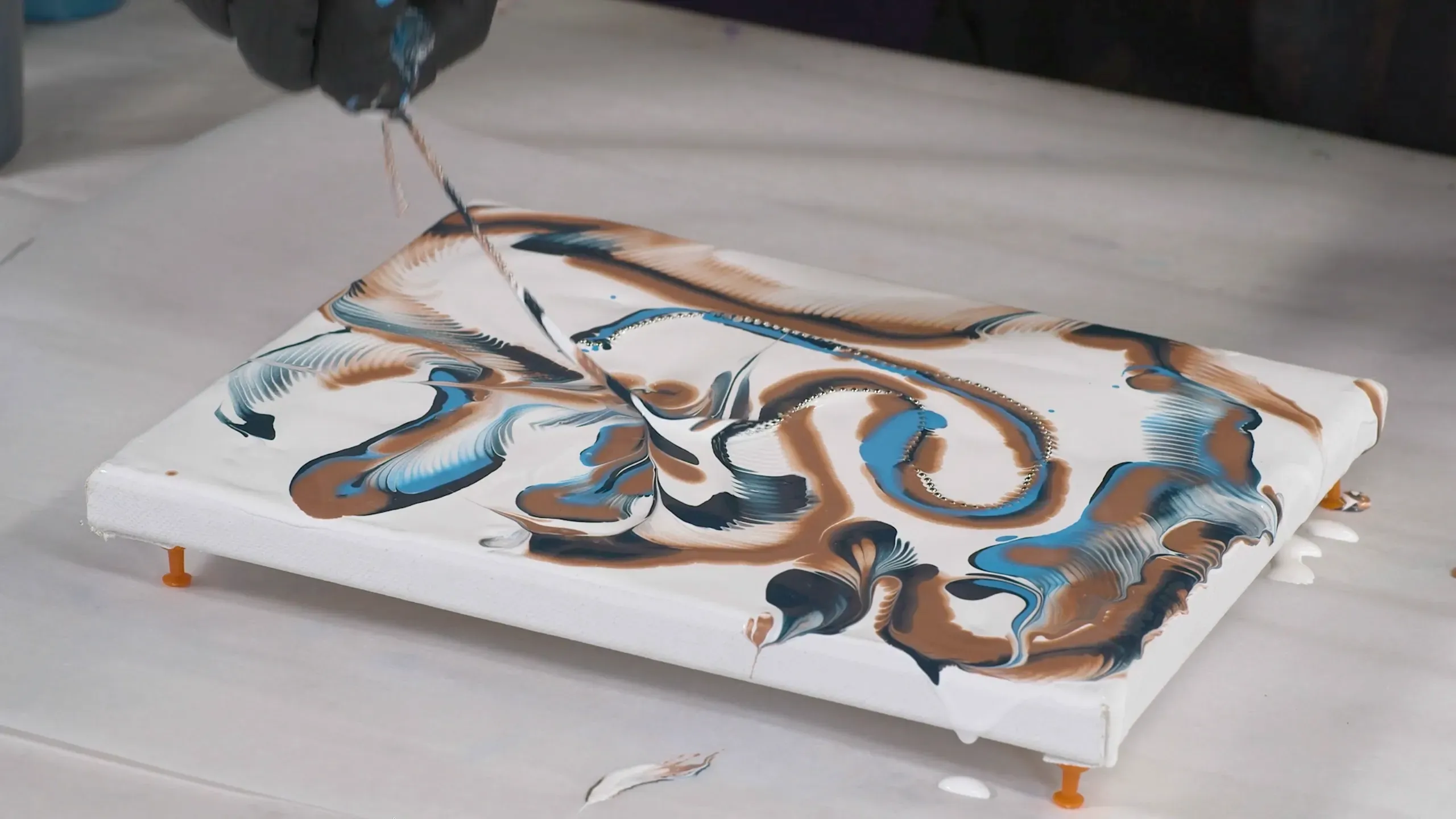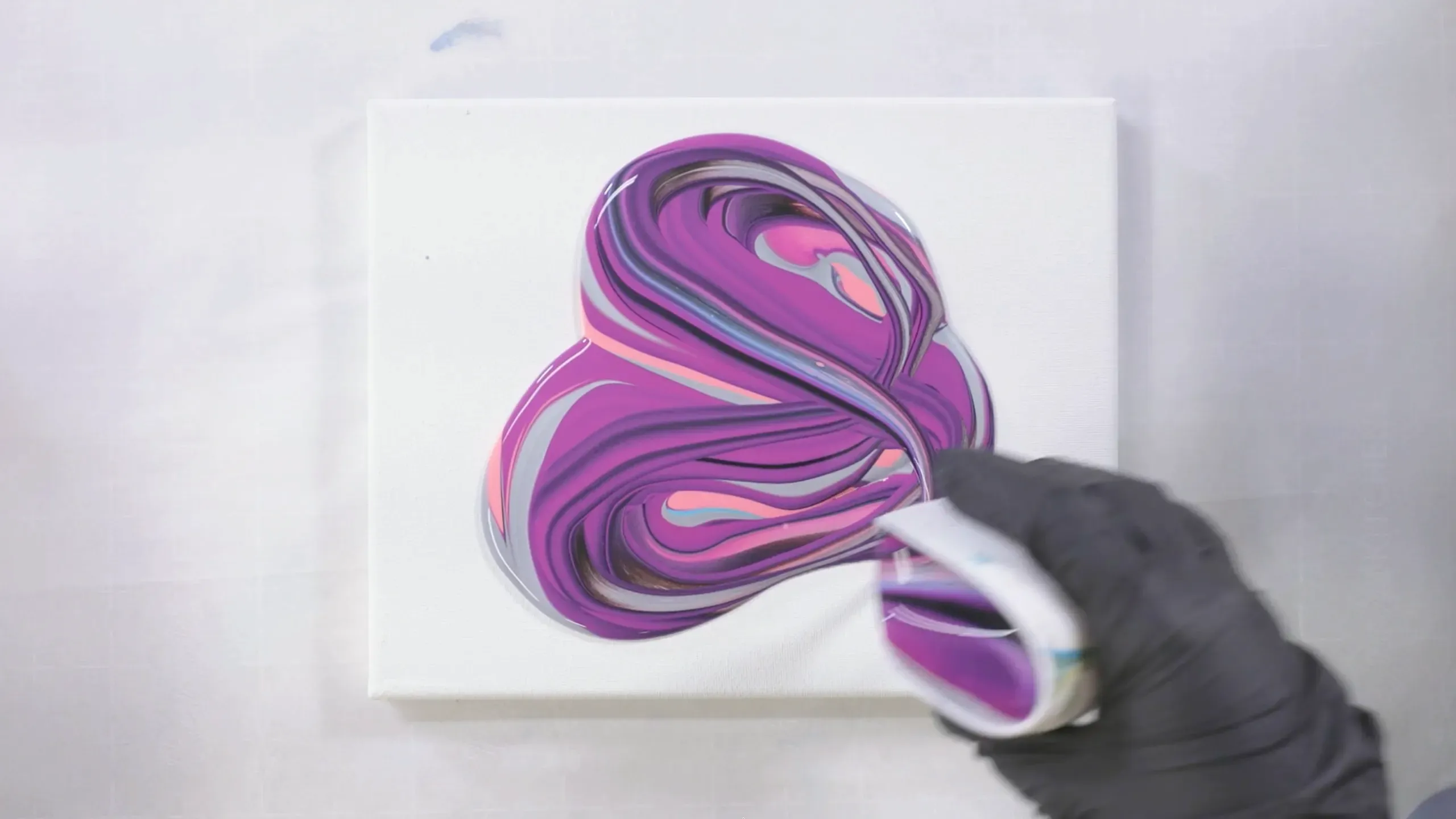 A fluid movement technique where paint is manipulated in a figure eight pattern to create flowing, interwoven designs.