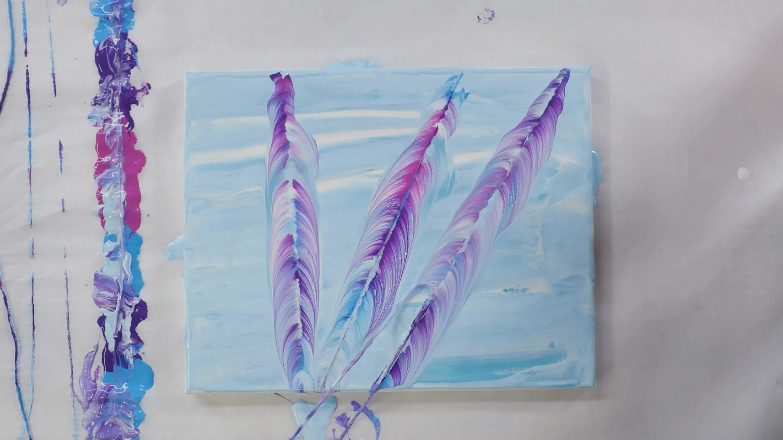 Flipping a paint-covered canvas onto another surface and dragging it to create unique stretched patterns.