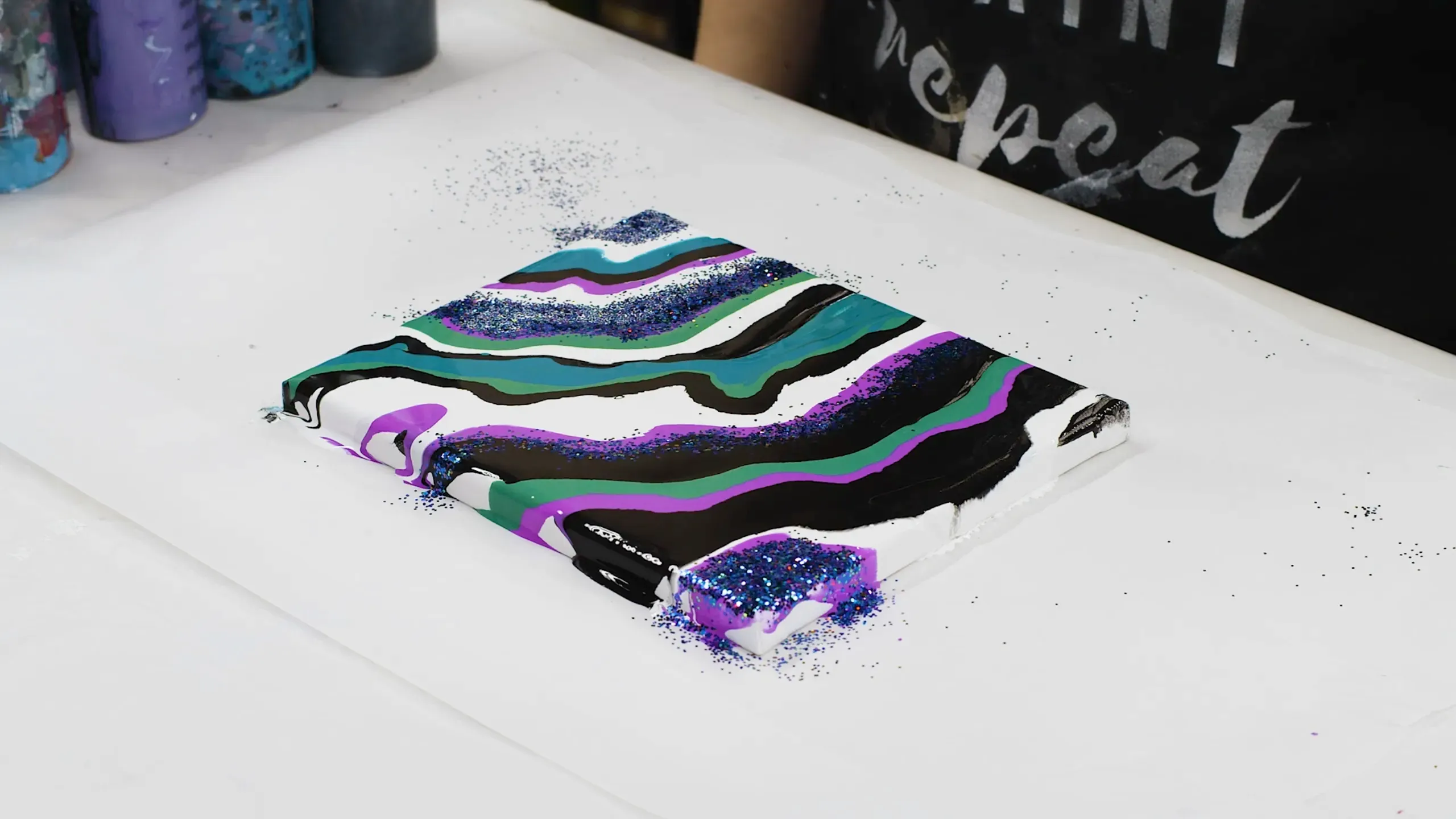 A layered pouring technique that creates wave-like patterns reminiscent of ocean shorelines and sandy beaches.