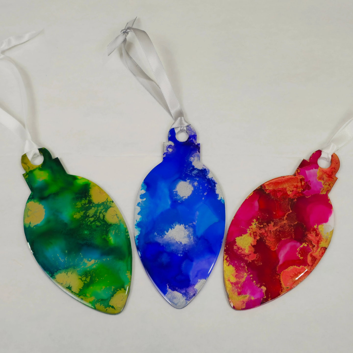 Transform simple bulb ornaments with rich, fluid alcohol ink designs that blend and bloom.